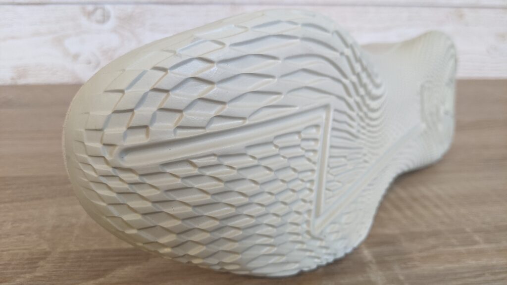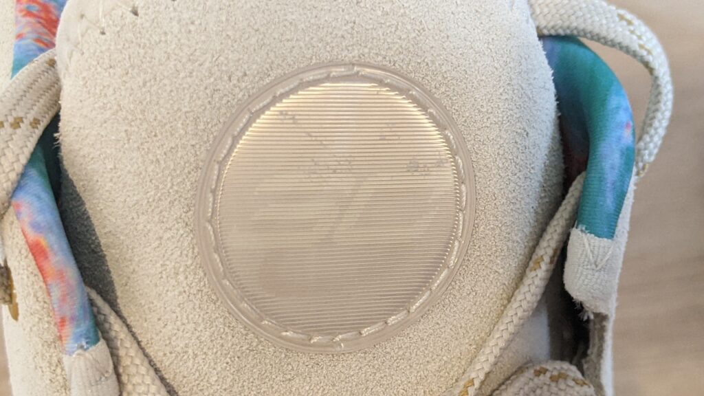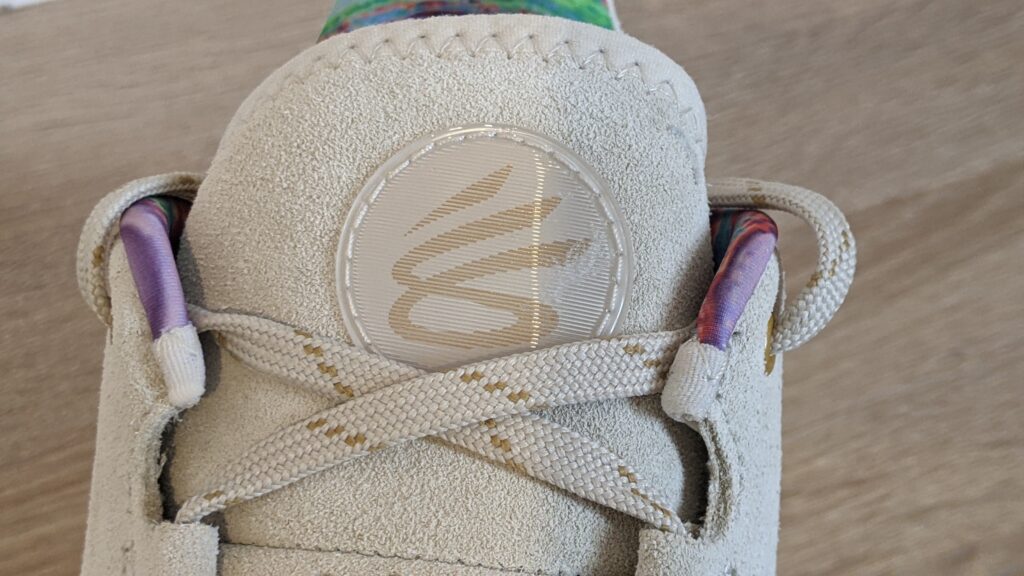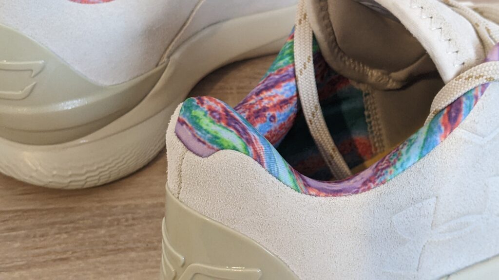 On retrouve le petit logo lenticulaire sur la languette, un détail toujours classe et spectaculaire. Autre détail sur ce coloris, l’intérieur coloré/bariolé de la chaussure qui tranche un peu avec l’aspect total look beige de la chaussure.