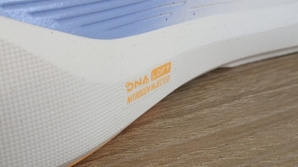 Autre point fort, l’amorti avec ici une mousse DNA LOFT v3 qui fait des merveilles. On a une excellente sensation de rebond à chaque foulée et que ce soit sur route ou chemin puisque le grip est très bien pensé lui aussi. On profite d’un bon dynamisme et d’une construction qui permet d’évacuer l’eau sur terrain humide. L’adhérence est top mais à condition de ne pas trop se frotter à des chemins plus rocailleux… Privilégiez la route.